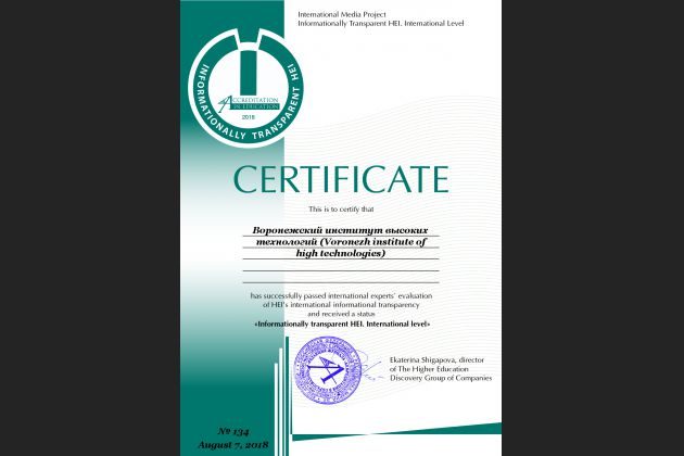 7 августа 2018 года Воронежский институт высоких технологий пополнил ряды информационно открытых вузов, получив сертификат "Готов к сотрудничеству. Уровень международный" международного конкурсного проекта "Информационно открытый университет. Уровень международный".